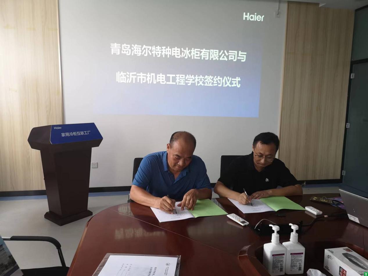 2022年8月8日,临沂市机电工程学校副校长李正军、青岛海尔特种电冰柜有限公司副总经理邵泽平在青岛代表双方签订了校企合作与产教融合协议书。