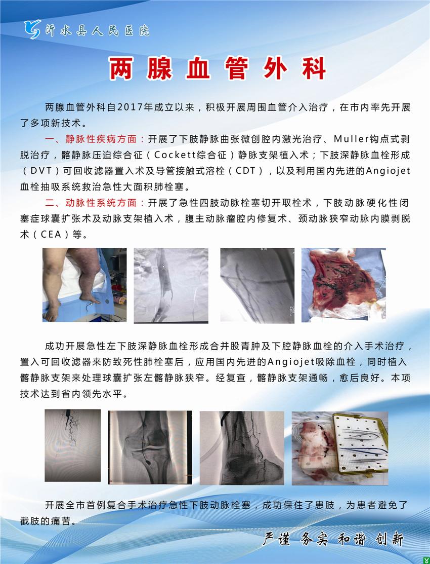 3.血管外科开展激光微创“零切口”治疗下肢静脉曲张,下腔静脉滤器防致死性肺栓塞,导管接触式溶栓治疗深静脉血栓形成,Angjioet吸栓治抢救股青肿,并“复合手术”DSA下取栓术抢救四肢动脉栓塞、股动脉闭塞球囊扩张+支架形成术、主动脉夹层、动脉瘤的腔内隔绝手术、糖尿病足治疗等达到省市级先进水平。