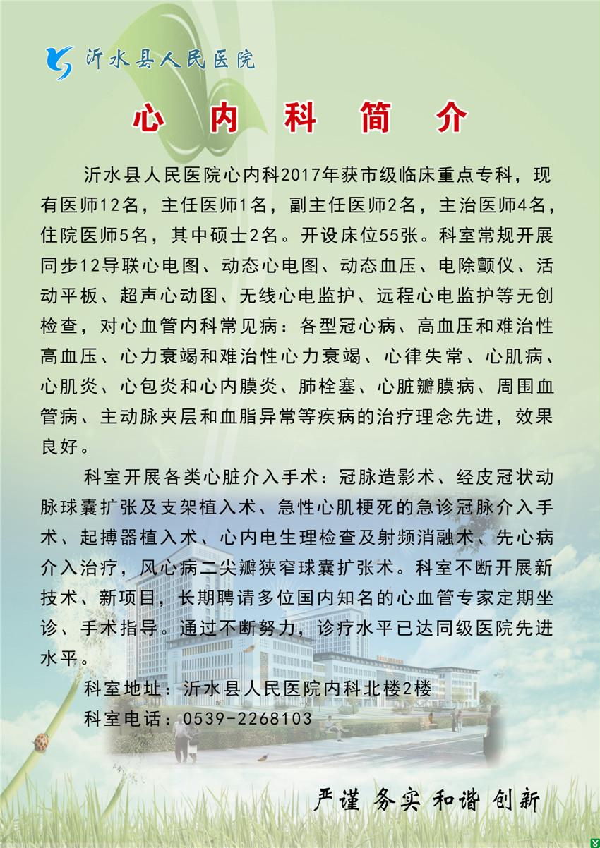 沂水县人民医院心内科2017年获市级临床重点专科,现有医师12名,主任医师1名,副主任医师2名,主治医师4名,住院医师5名,其中硕士2名。开设床位55张。科室常规开展同步12导联心电图、动态心电图、动态血压、电除颤仪、活动平板、超声心动图、无线心电监护、远程心电监护等无创检查,对心血管内科常见病:各型冠心病、高血压和难治性高血压、心力衰竭和难治性心力衰竭、心律失常、心肌病、心肌炎、心包炎和心内膜炎、肺栓塞、心脏瓣膜病、周围血管病、主动脉夹层和血脂异常等疾病的治疗理念先进,效果良好。