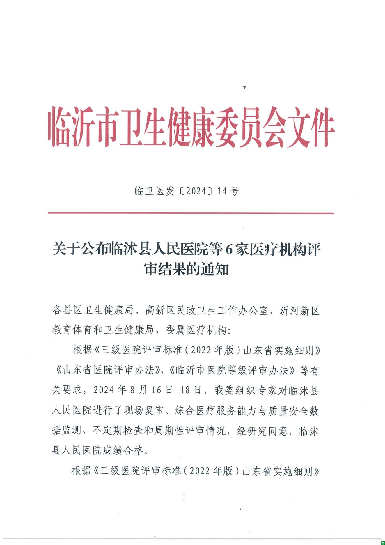 | 标 题: | 沂水县马站人民医院等级评审证明 | ||