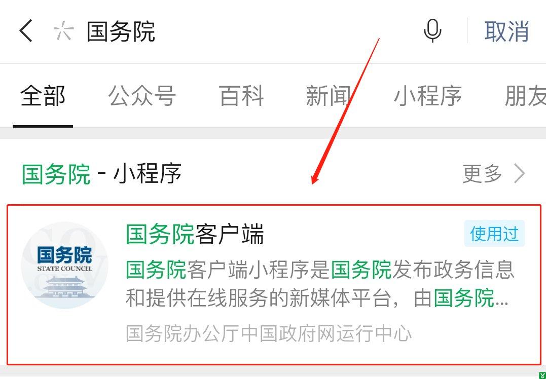 1.使用微信搜索“国务院”,点击进入国务院客户端小程序,或长按识别下方二维码进入小程序;