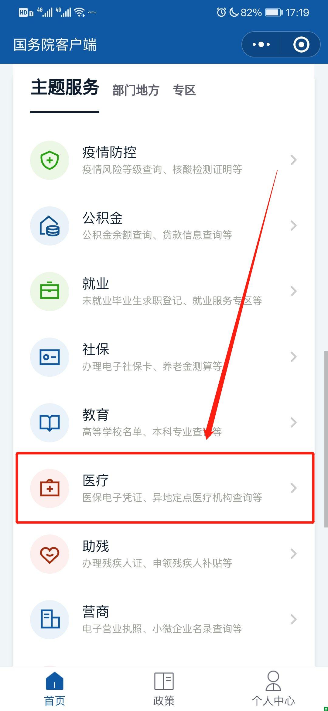 2.进入小程序后,在主页中下拉,并点击主题服务中的“医疗”;