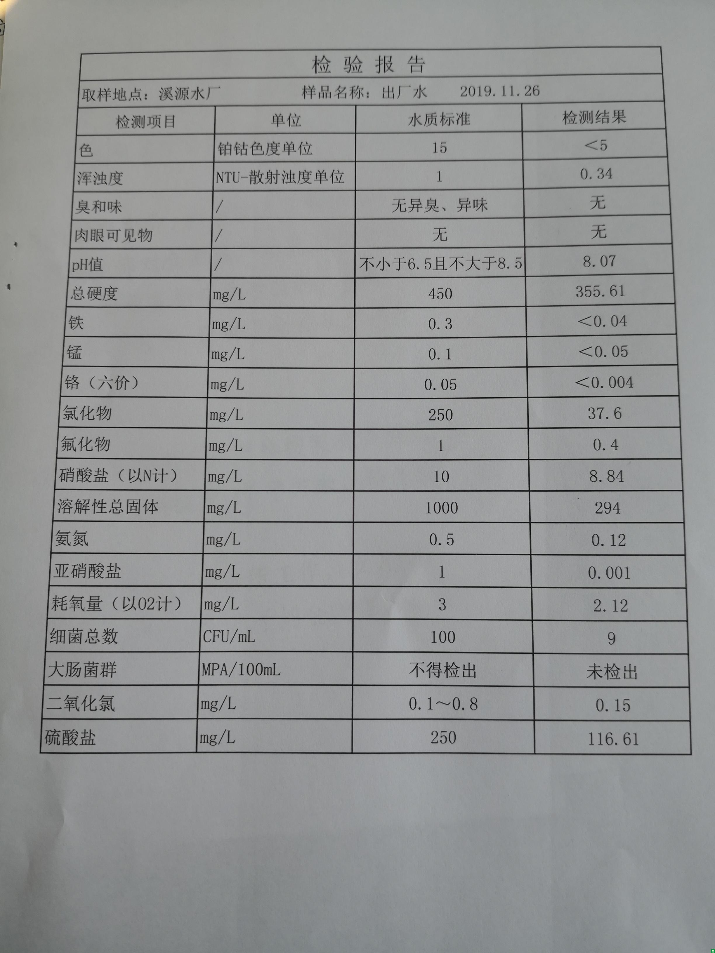 | 标 题: | 2019年11月份溪源水厂水质全分析检验报告 | ||