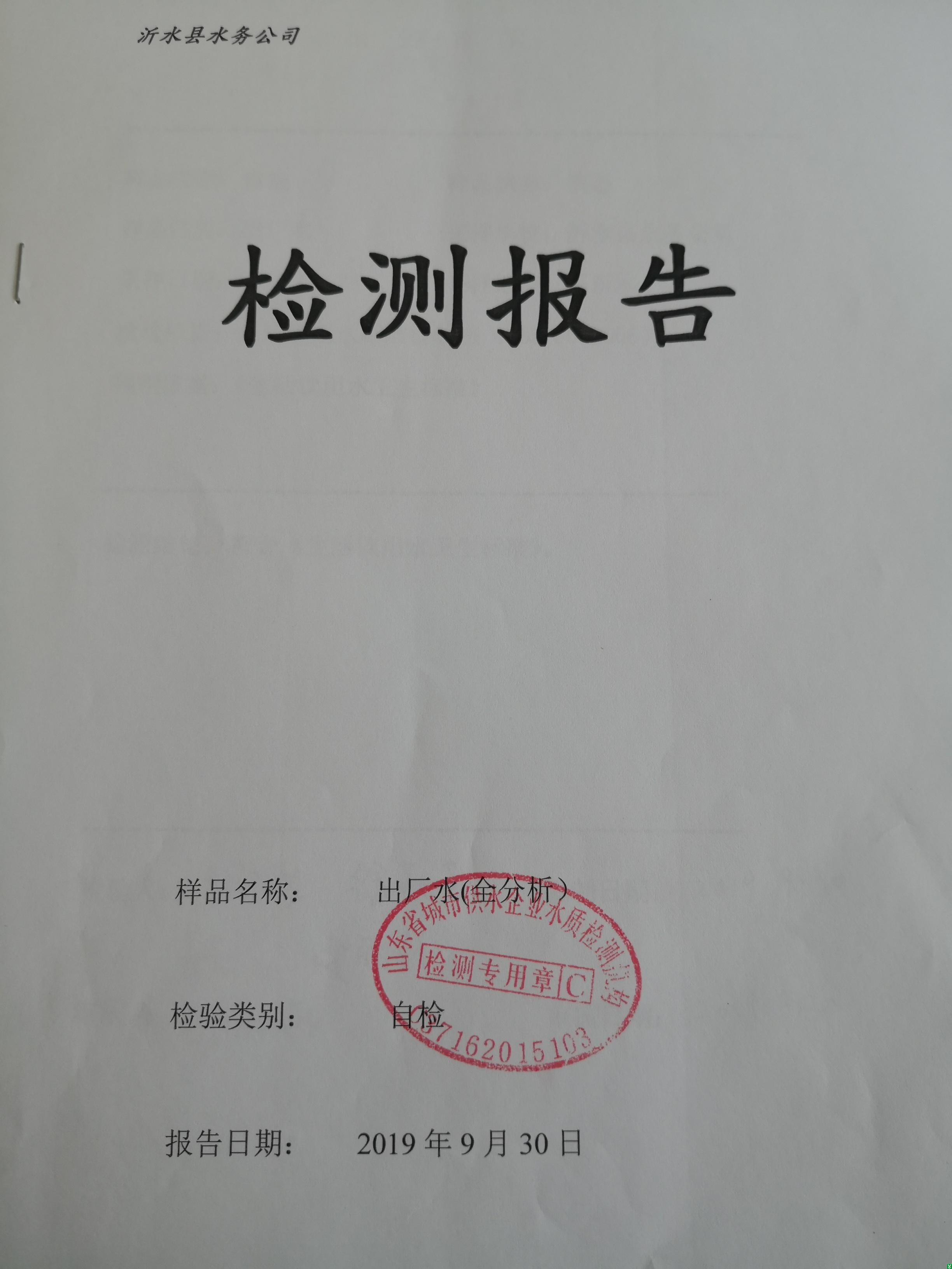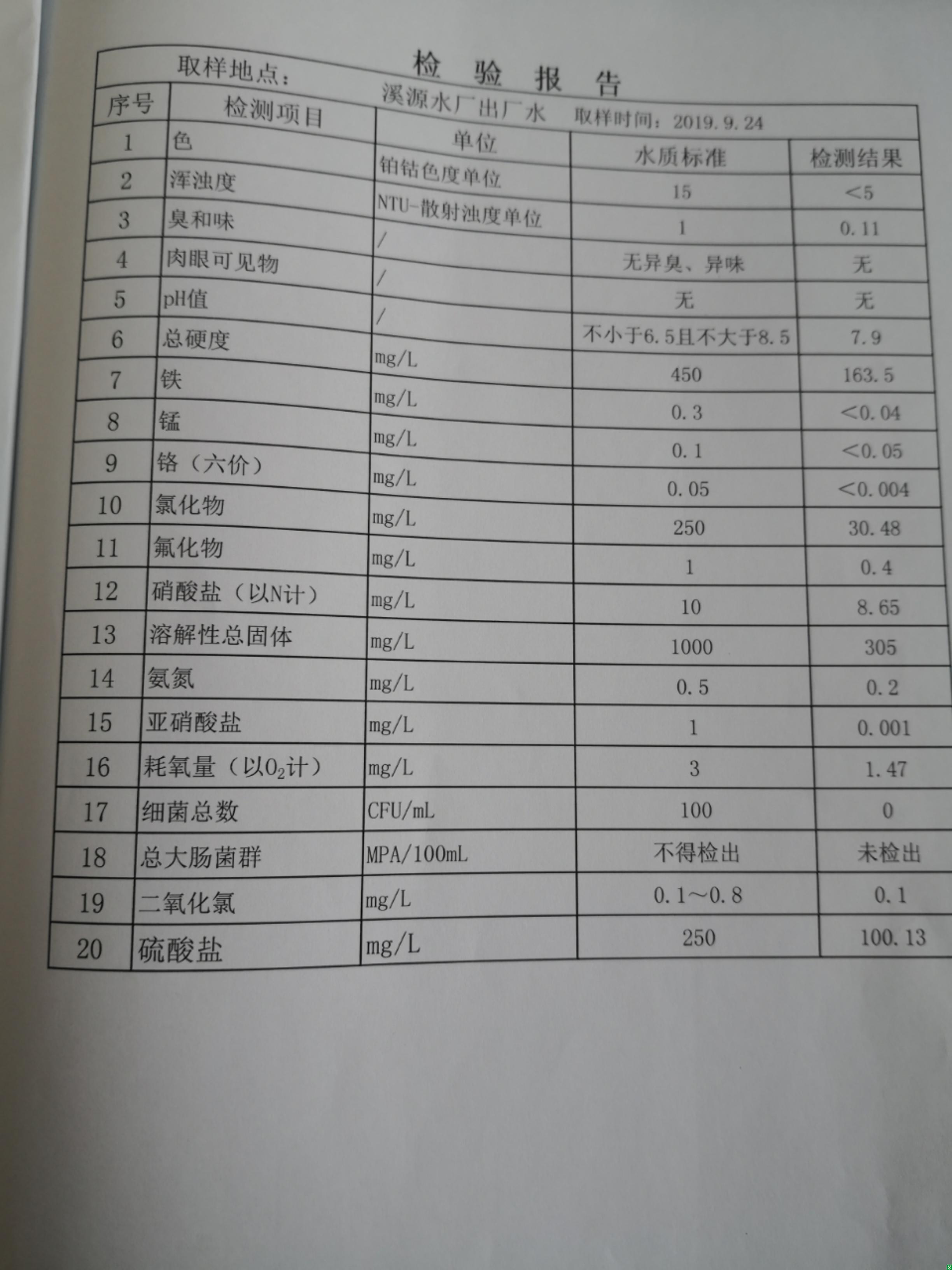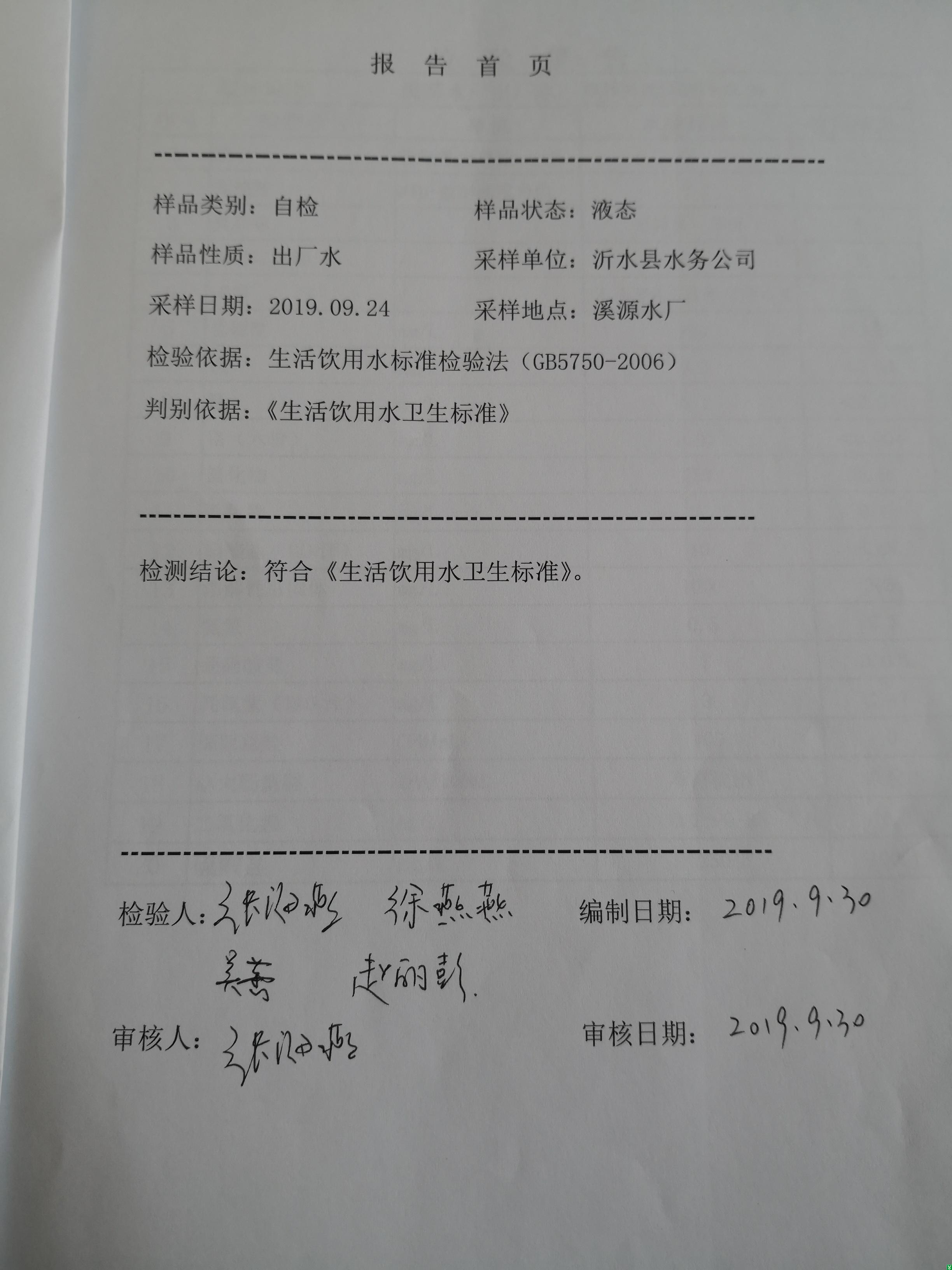 | 标 题: | 2019年9月份溪源水厂水质全分析检验报告 | ||