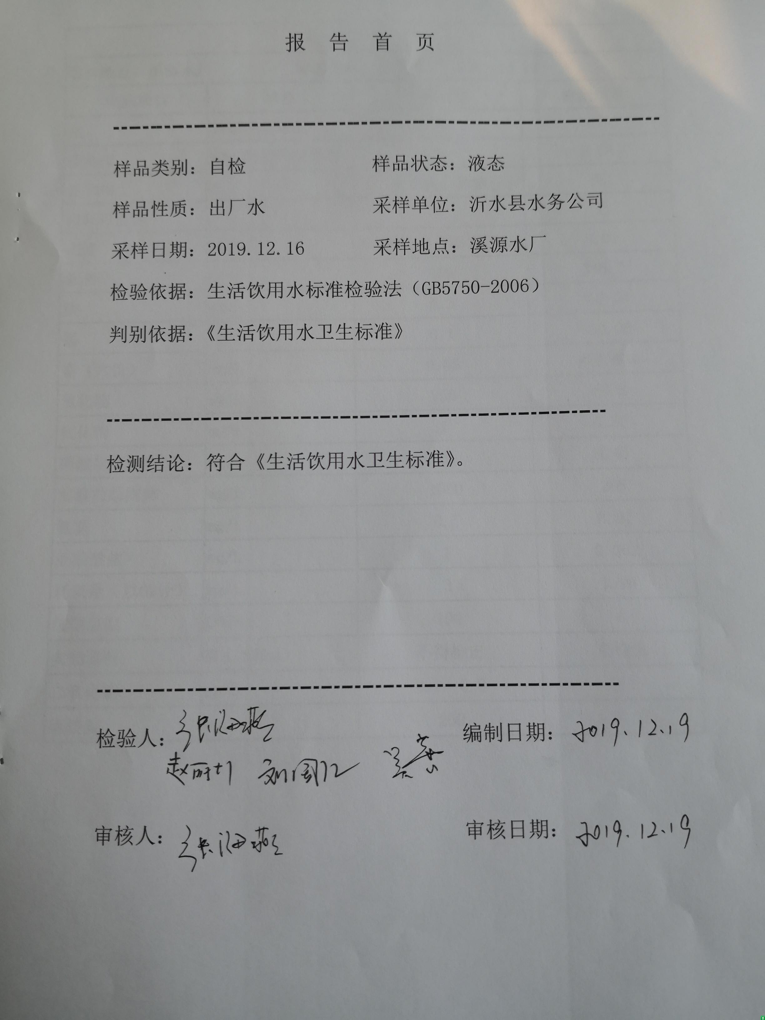| 标 题: | 2019年12月份溪源水厂水质全分析检验报告 | ||