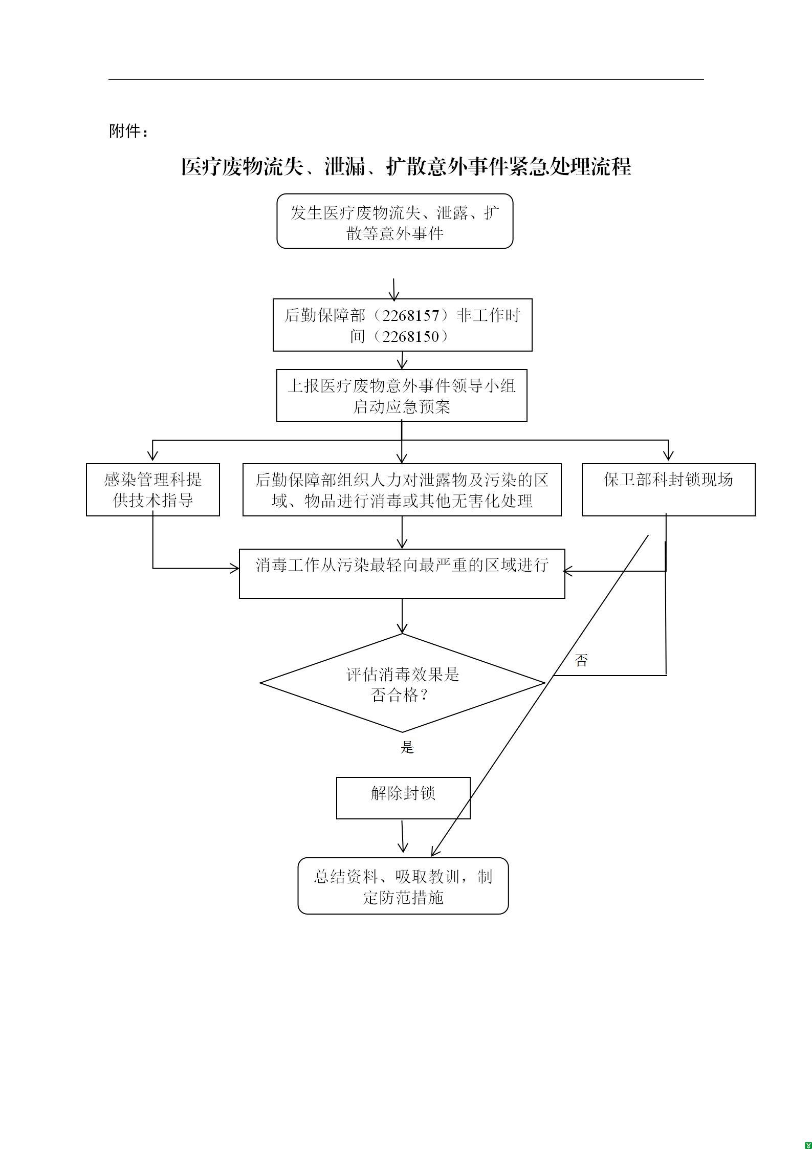 7、处理工作结束后,医疗废物意外事件领导小组写出总结,对事件的起因进行调查,汇总资料,并完善防范措施,预防类似事件发生。