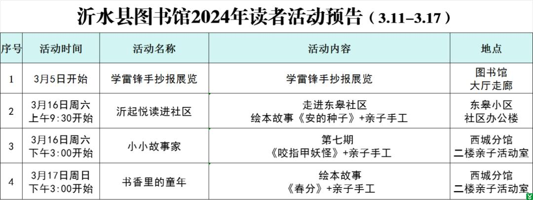 | 标 题: | 沂水县图书馆2024年读者活动预告(3.11-3.17) | ||