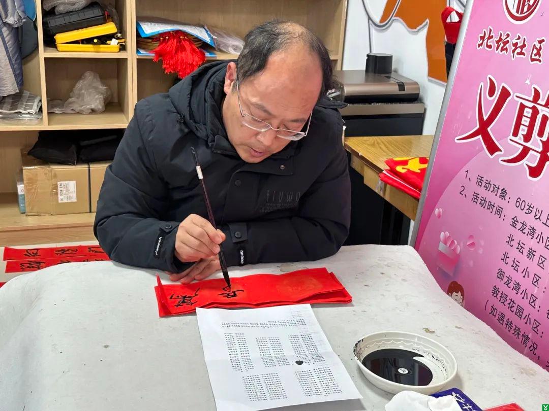 笔墨挥毫书新岁,纸笔携香迎新年。北坛社区党群服务中心现场,洋溢着欢快与温馨的氛围。书法家们铺展朱红宣纸,挽袖执笔,挥毫泼墨,笔锋游走间,或苍劲有力、或飘逸灵动的字迹跃然纸上,“一帆风顺年年好,万事如意步步高”,一幅幅寓意吉祥的春联饱含着居民对新年的美好憧憬。居民们热情高涨,纷纷围聚在书法家的案桌前,精心挑选着自己心仪的春联内容,大家帮忙压纸、晾春联,与志愿者们一起传递着新春的祝福。