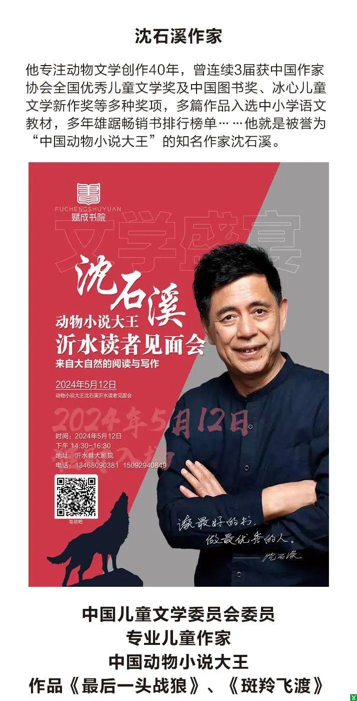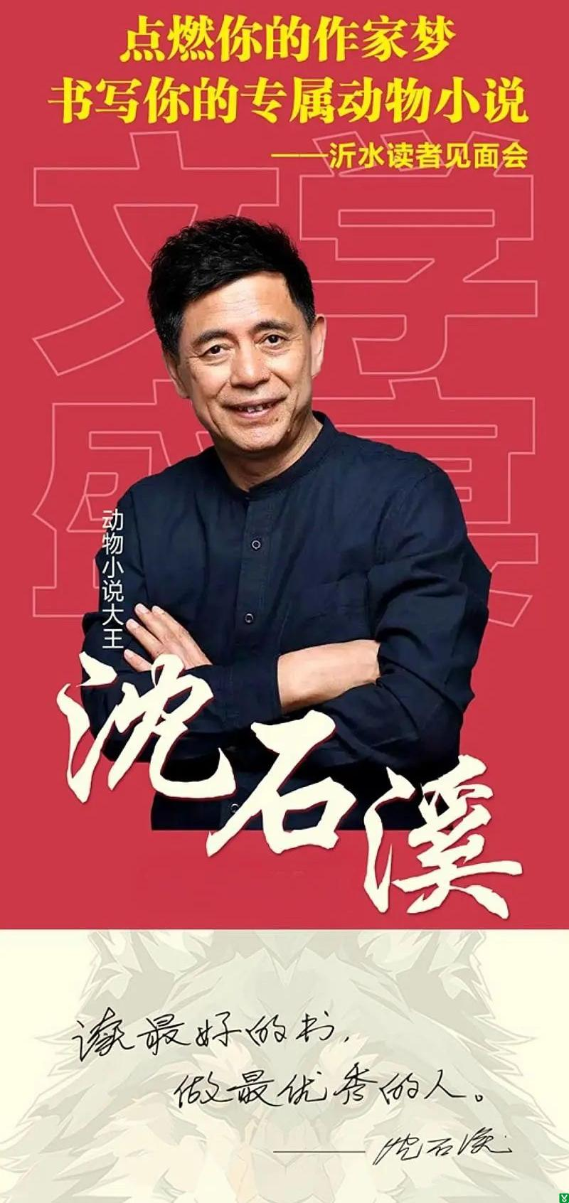 | 标 题: | 【活动预告】动物小说大王、著名文学作家——沈石溪走进沂水大型公益讲座!面对面激发孩子的阅读与创作,点亮你的文学梦! | ||