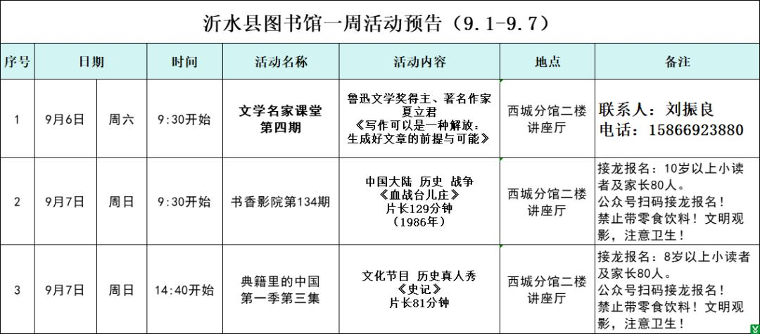 | 标 题: | 【活动预告】沂水县图书馆本周活动预告(9.1-9.7) | ||