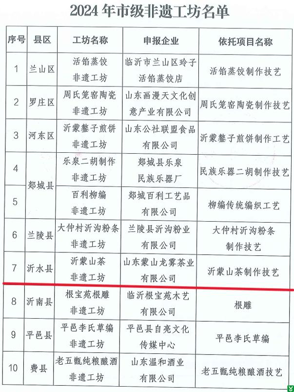 近日,市文化和旅游局、市人力资源和社会保障局、市农业农村局联合公布了2024年市级非遗工坊名单,我县沂蒙山茶非遗工坊成功入选。
