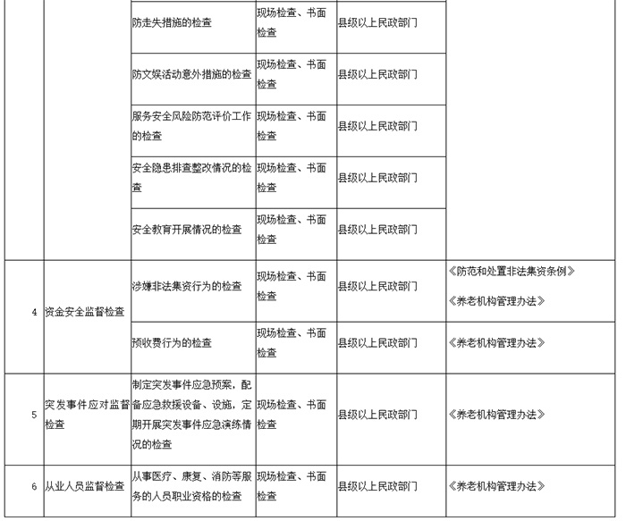 (一)统一编制随机抽查事项清单。按照职能优化、协同高效要求,民政部、住房和城乡建设部、市场监管总局聚焦养老机构安全和质量管理,共同编制《养老机构重点检查事项清单》(以下简称《清单》,见附件)。省级民政部门要对照《清单》,会同同级住房和城乡建设、市场监管部门梳理行使的监管执法事项,制定省级抽查事项清单,确定重点检查事项和一般检查事项。重点检查事项要覆盖建筑、特种设备、服务安全和质量等重要领域,抽查比例不设上限;抽查比例高的,可以通过随机抽取的方式确定检查批次顺序。其中,对养老机构服务安全和质量,要保证每年不少于一次的现场检查。一般检查事项主要包括运营资质、备案事项、合同管理、服务收费、信息公开、规章制度等内容,抽查比例应根据监管实际情况设置上限。检查事项应当根据法律法规规章和工作需要等进行动态调整,并及时向社会公开。