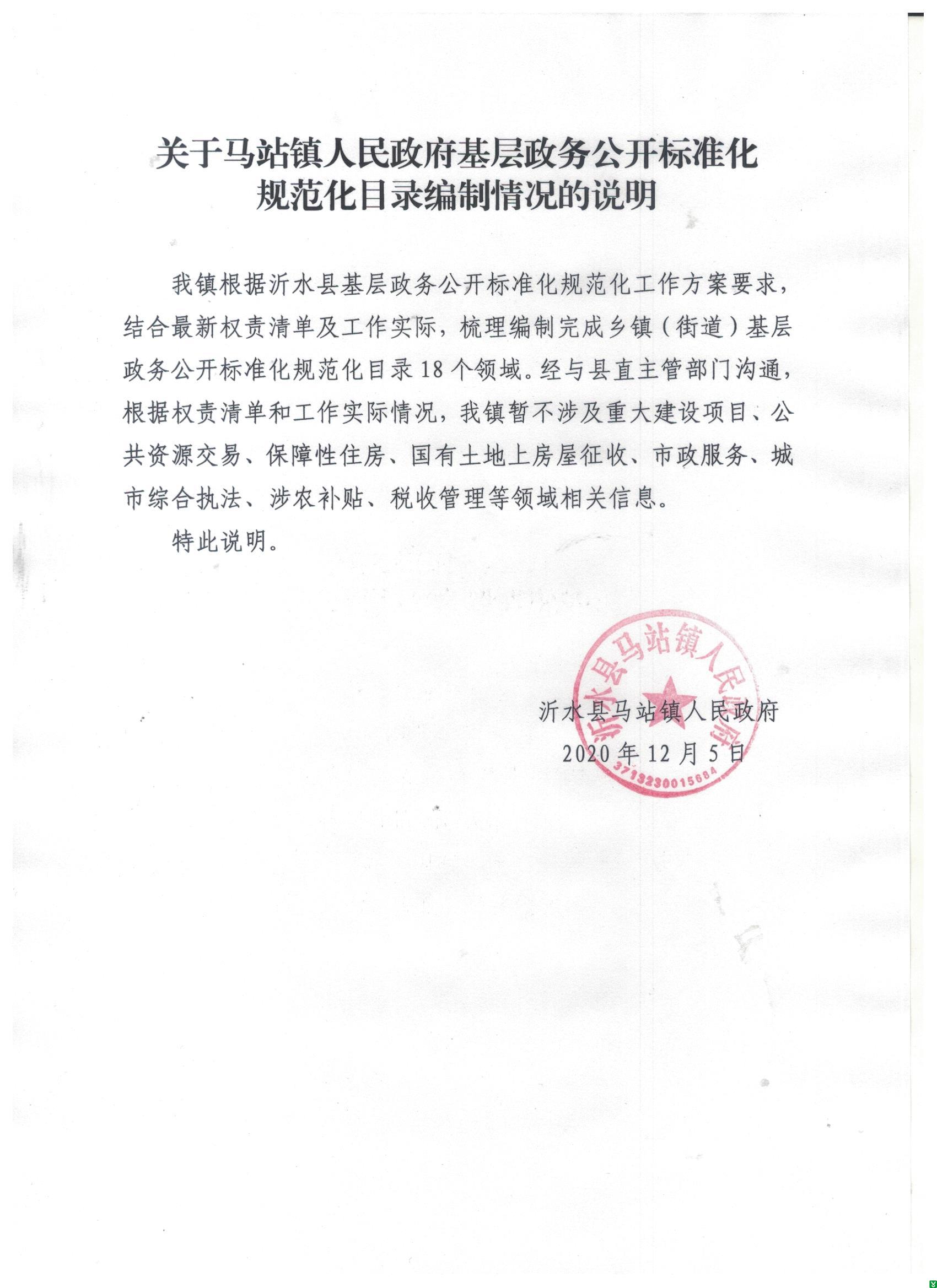 | 标 题: | 关于马站镇人民政府基层政务公开标准化规范化目录编制情况的说明 | ||