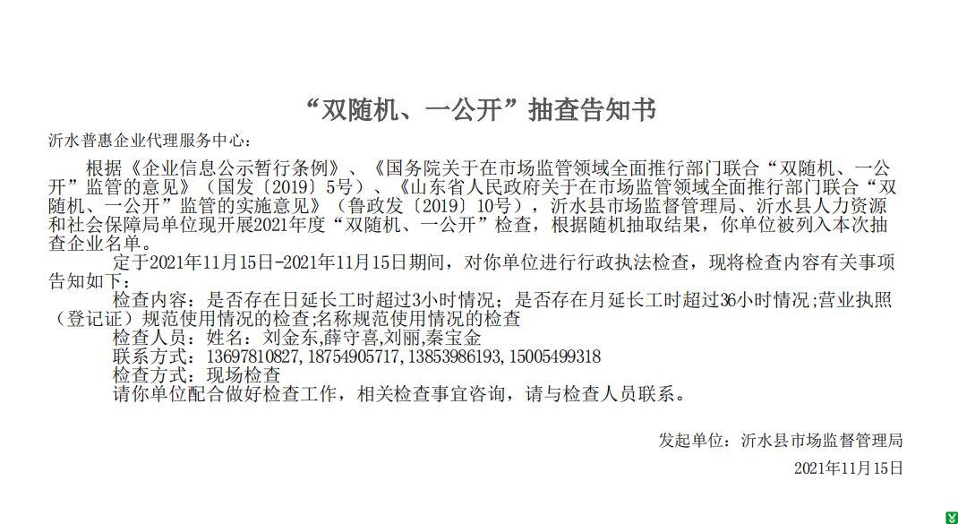 | 标 题: | 沂水普惠企业代理服务中心“双随机、一公开”抽查告知书 | ||