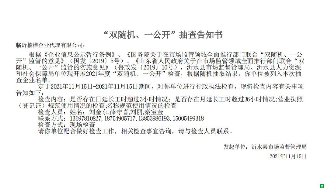 | 标 题: | 临沂楠桦企业代理有限公司“双随机、一公开”抽查告知书 | ||