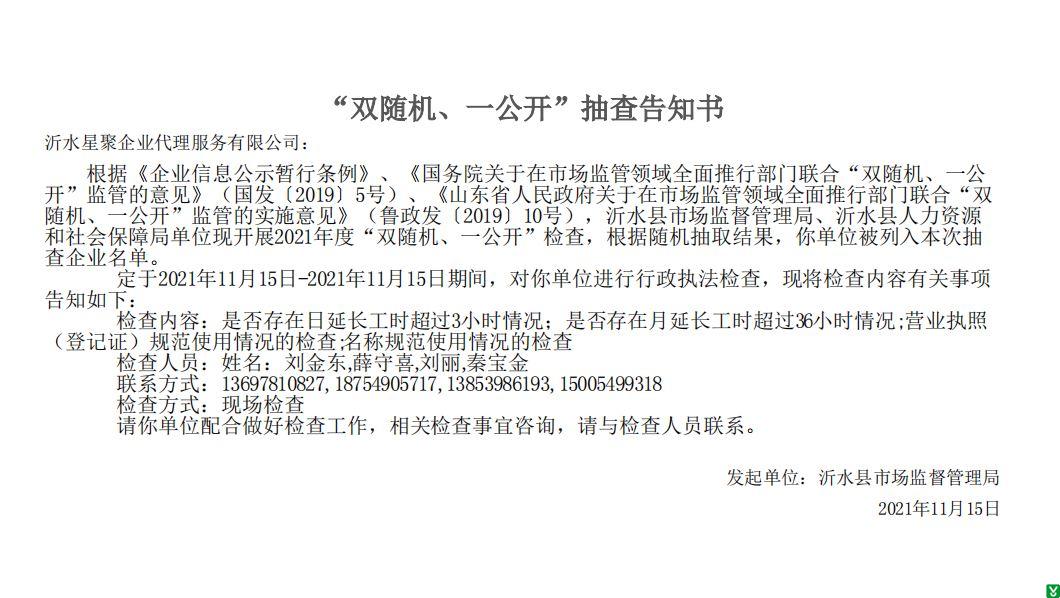 | 标 题: | 沂水星聚企业代理服务有限公司“双随机、一公开”抽查告知书 | ||