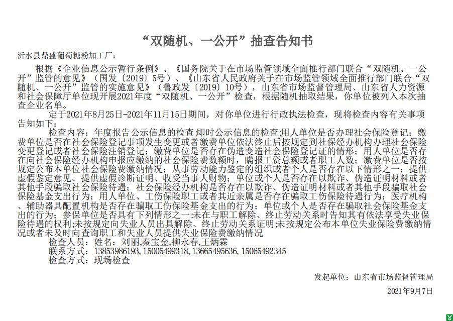 | 标 题: | 沂水县鼎盛葡萄糖粉加工厂“双随机、一公开”抽查告知书 | ||