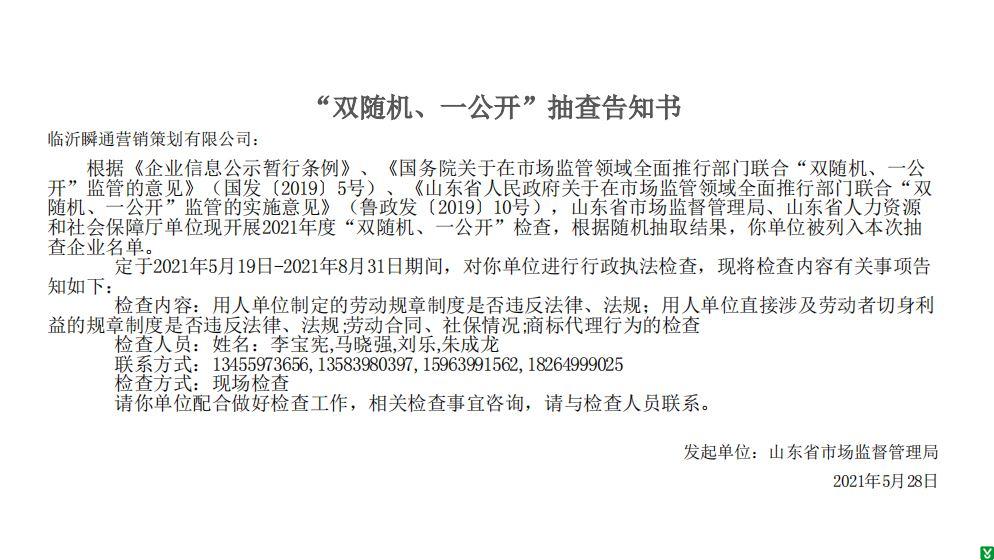 | 标 题: | 临沂瞬通营销策划有限公司“双随机、一公开”抽查告知书 | ||