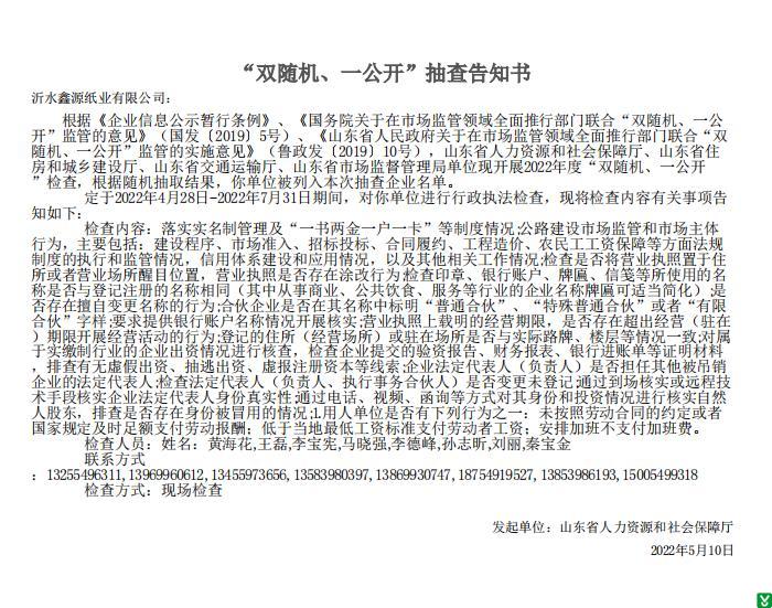 | 标 题: | 沂水鑫源纸业有限公司“双随机、一公开”抽查告知书 | ||