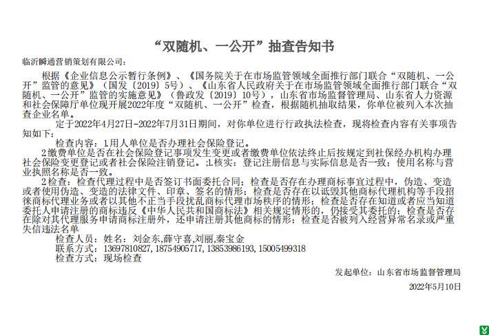| 标 题: | 临沂瞬通营销策划有限公司“双随机、一公开”抽查告知书 | ||