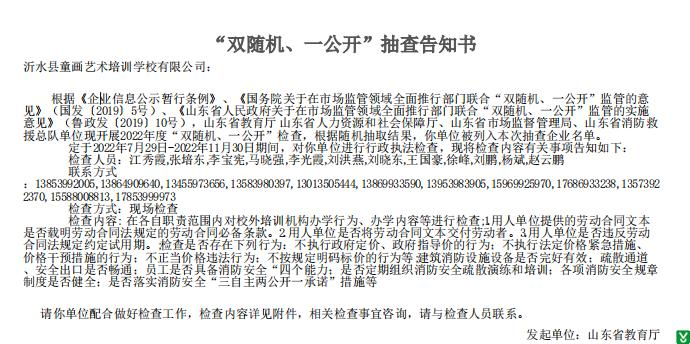 | 标 题: | 沂水县童画艺术培训学校有限公司“双随机、一公开”抽查告知书 | ||