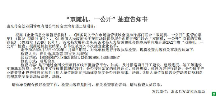 | 标 题: | 山东传宝创业园管理有限公司传宝龙湾帝璟二期项目“双随机、一公开”抽查告知书 | ||
