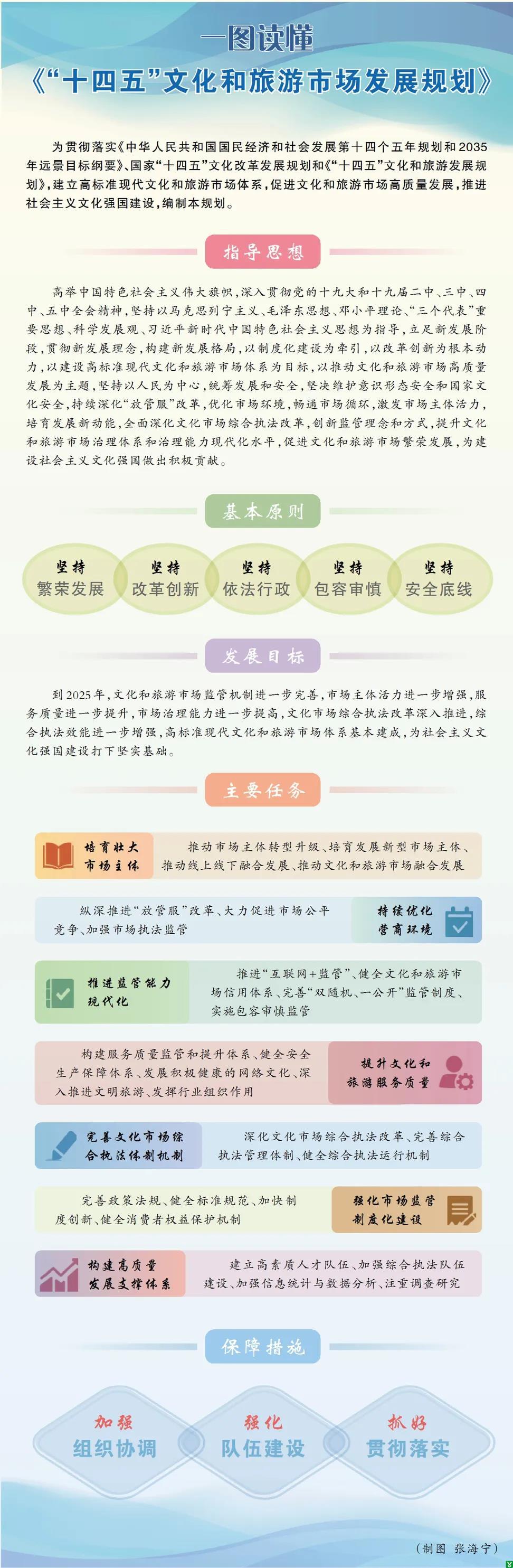 《规划》将坚持繁荣发展、坚持改革创新、坚持依法行政、坚持包容审慎、坚持安全底线作为基本原则,提出了到2025年,文化和旅游市场监管机制进一步完善,市场主体活力进一步增强,服务质量进一步提升,市场治理能力进一步提高,文化市场综合执法改革深入推进,综合执法效能进一步增强,高标准现代文化和旅游市场体系基本建成的发展目标,并对2035年远景目标作出展望。