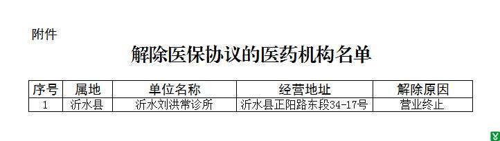 根据山东省医疗保障局《关于改革完善医保定点医药机构协议管理的指导意见(试行)》(鲁医保发【2019】85号)、《临沂市统一医疗保障经办服务办事指南》(2020年7月)等有关规定,经医药机构自主申报、材料审核、实地审验、谈判协商,拟解除1家医药机构医保协议,现予以公示(名单见附件)。
