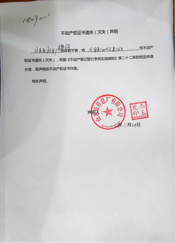 | 标 题: | 不动产权证书遗失(灭失)声明 山东连杆总厂有限公司 | ||