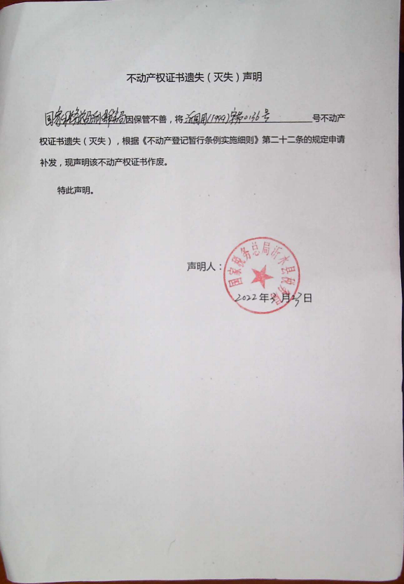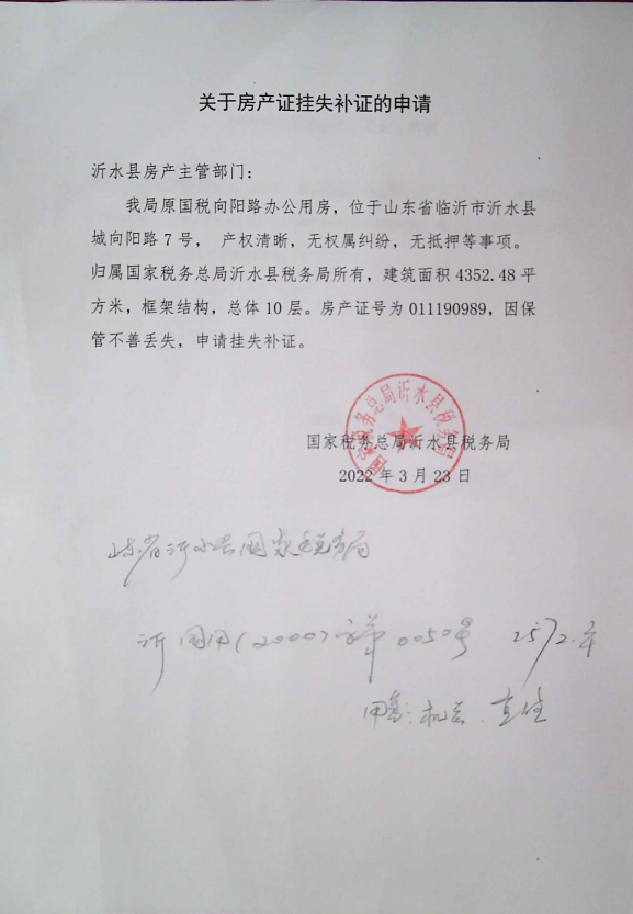国家税务总局沂水县税务局 因保管不善,将 沂国用(1999)字第0136号 、沂房字第011190989号不动产权证书遗失(灭失),根据《不动产登记暂行条例实施细则》第二十二条的规定申请补发,现声明该不动产权证书作废。
