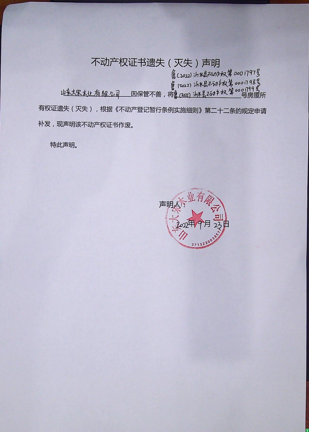 山东大宋木业有限公司因保管不善,将鲁(2022)沂水县不动产产权第0001797号、鲁(2022)沂水县不动产产权第0001798号、 鲁(2022)沂水县不动产产权第0001799号 不动产权证书或不动产登记证明遗失(灭失),根据《不动产登记暂行条例实施细则》第二十二条的规定申请补发,现声明该不动产权证书或不动产登记证明作废。