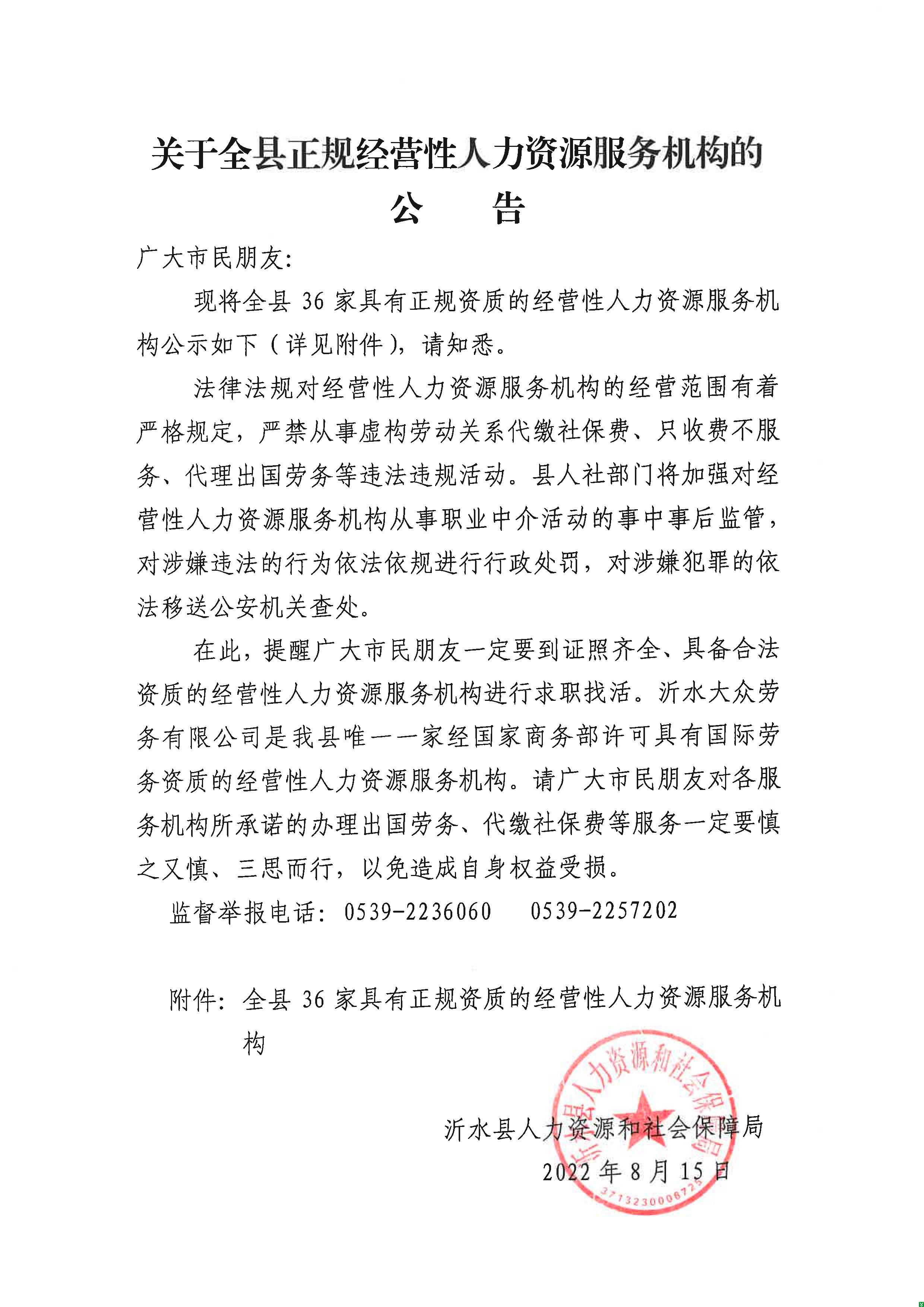 | 标 题: | 关于全县正规经营性人力资源服务机构的公告 | ||
