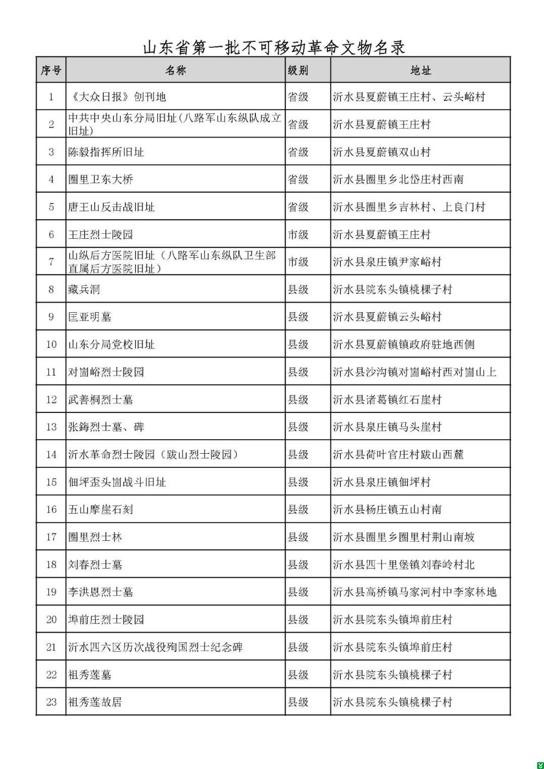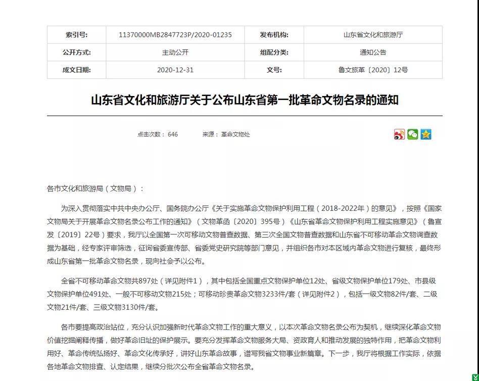 2020年12月31日,省文化和旅游厅公布了山东省第一批革命文物名录,共公布不可移动革命文物897处,可移动珍贵革命文物3233件/套,其中,我县有23处不可移动文物入列。
