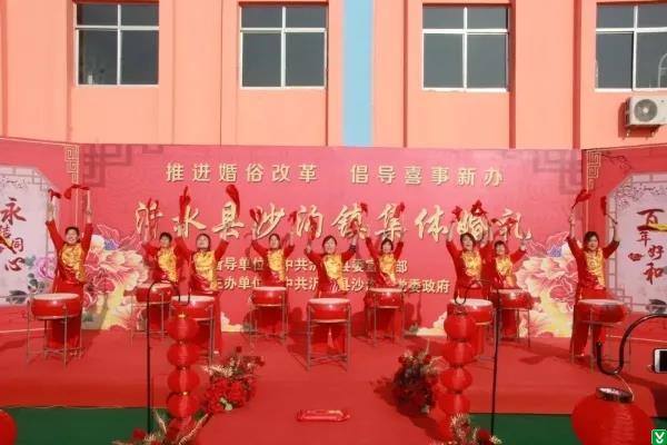 沙沟镇首届集体婚礼--“同心筑梦·幸福启航”在文化志愿者表演的鼓乐《好日子》、舞蹈《张灯结彩》中正式拉开序幕。