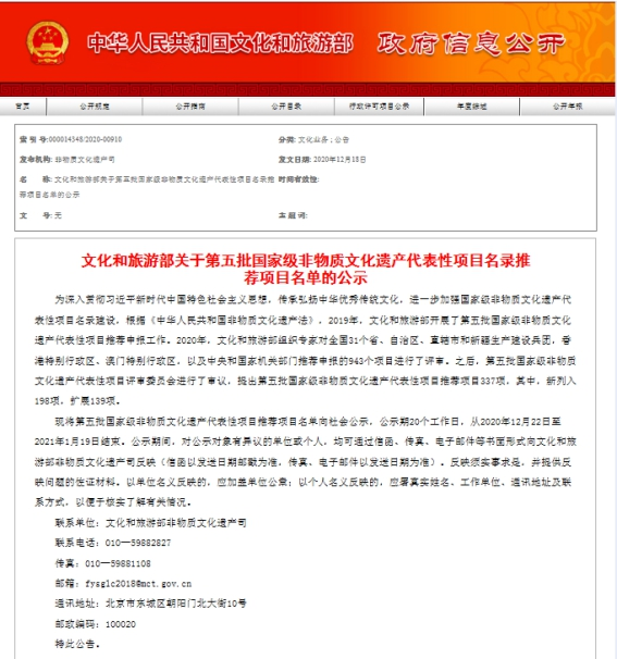 12月18日,国家文化和旅游部发布《关于第五批国家级非物质文化遗产代表性项目名录推荐项目名单的公示 》,我县高桥手绣(鲁绣)在公示名单内。