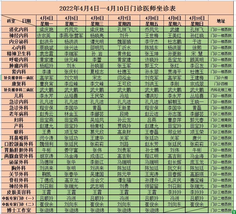 | 标 题: | 沂水县人民医院门诊医师坐诊排班4月4日-10日 | ||