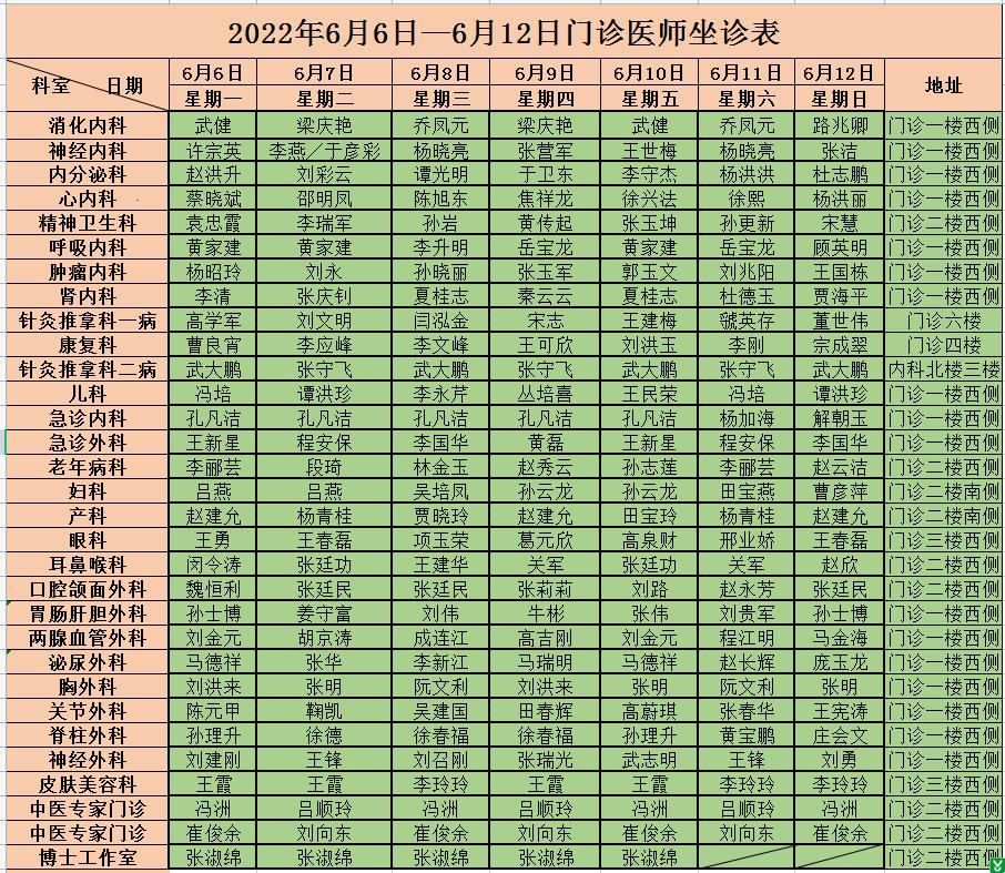 | 标 题: | 沂水县人民医院门诊医师坐诊排班6月6日-12日 | ||