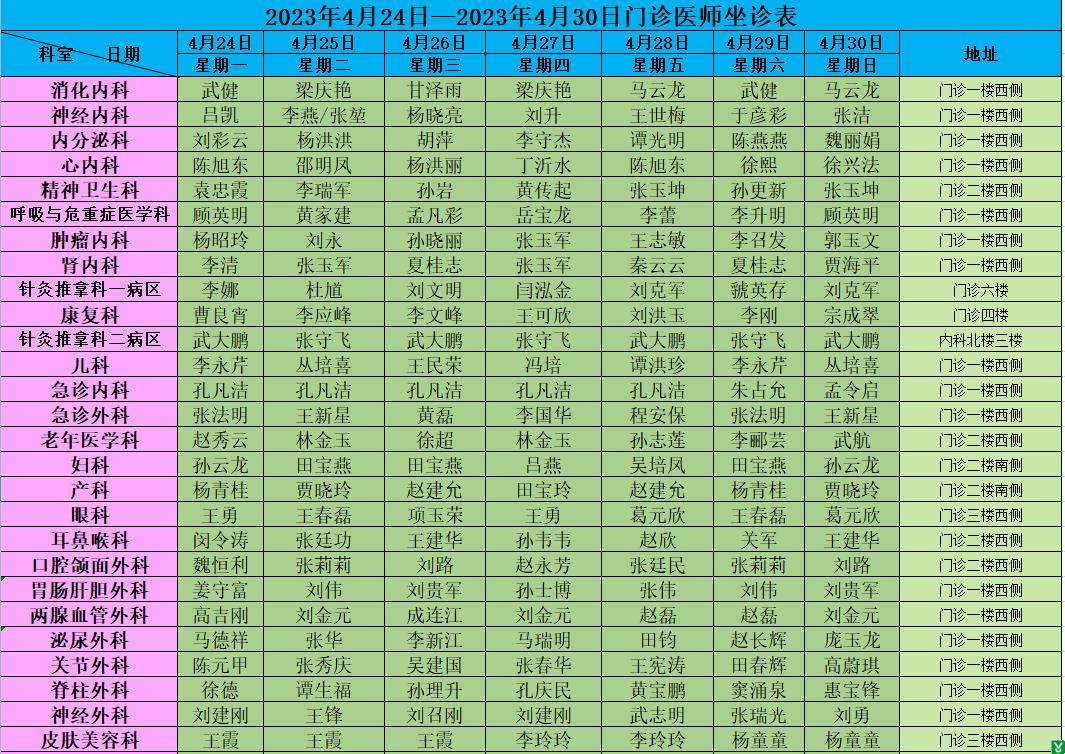 | 标 题: | 沂水县人民医院门诊医师坐诊排班(4月24日-30日) | ||
