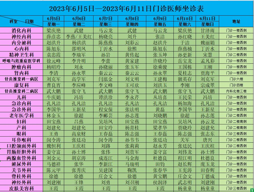 | 标 题: | 沂水县人民医院门诊医师坐诊排班(6月5日-6月11日) | ||
