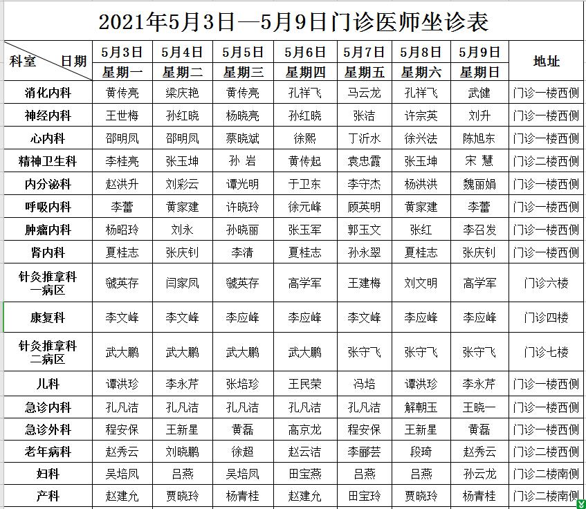 | 标 题: | 沂水县人民医院5月3日-9日门诊医师坐诊排班表 | ||