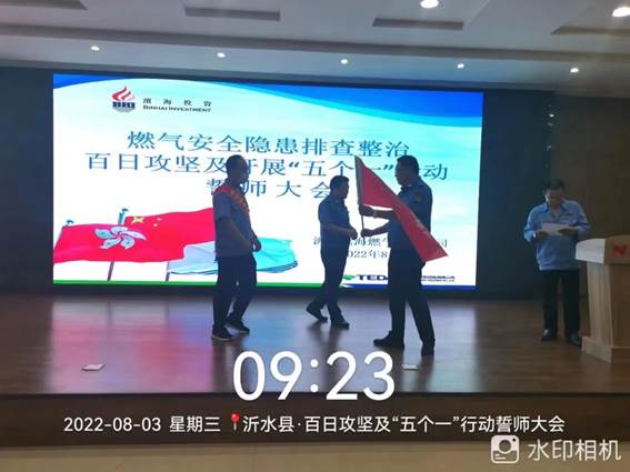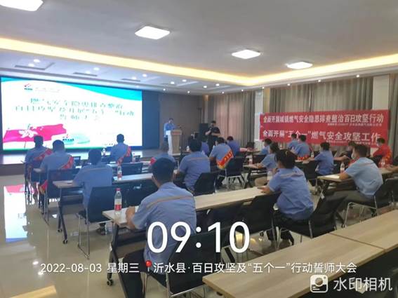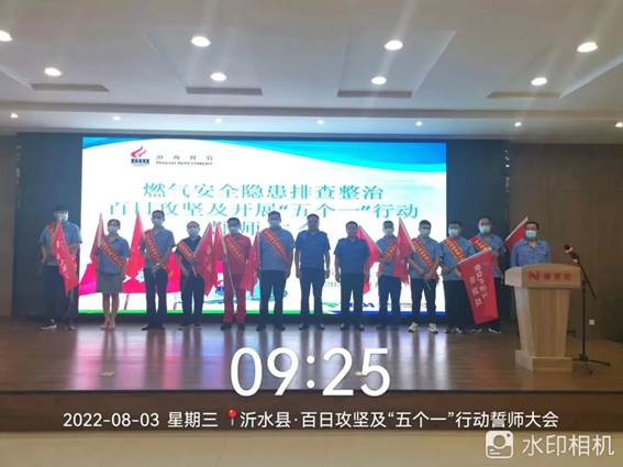 8月3日,沂水县城市管理局联合沂水滨海燃气有限公司开展燃气安全隐患排查整治“百日行动”及开展“五个一”行动誓师大会,燃气安全检查攻坚队 、餐饮户安全装置攻坚队(报警器)、民用户安全装置攻坚队(自闭阀+波纹管)等10个攻坚突击队代表递交《军令状》,宣誓保证完成排查整治任务。