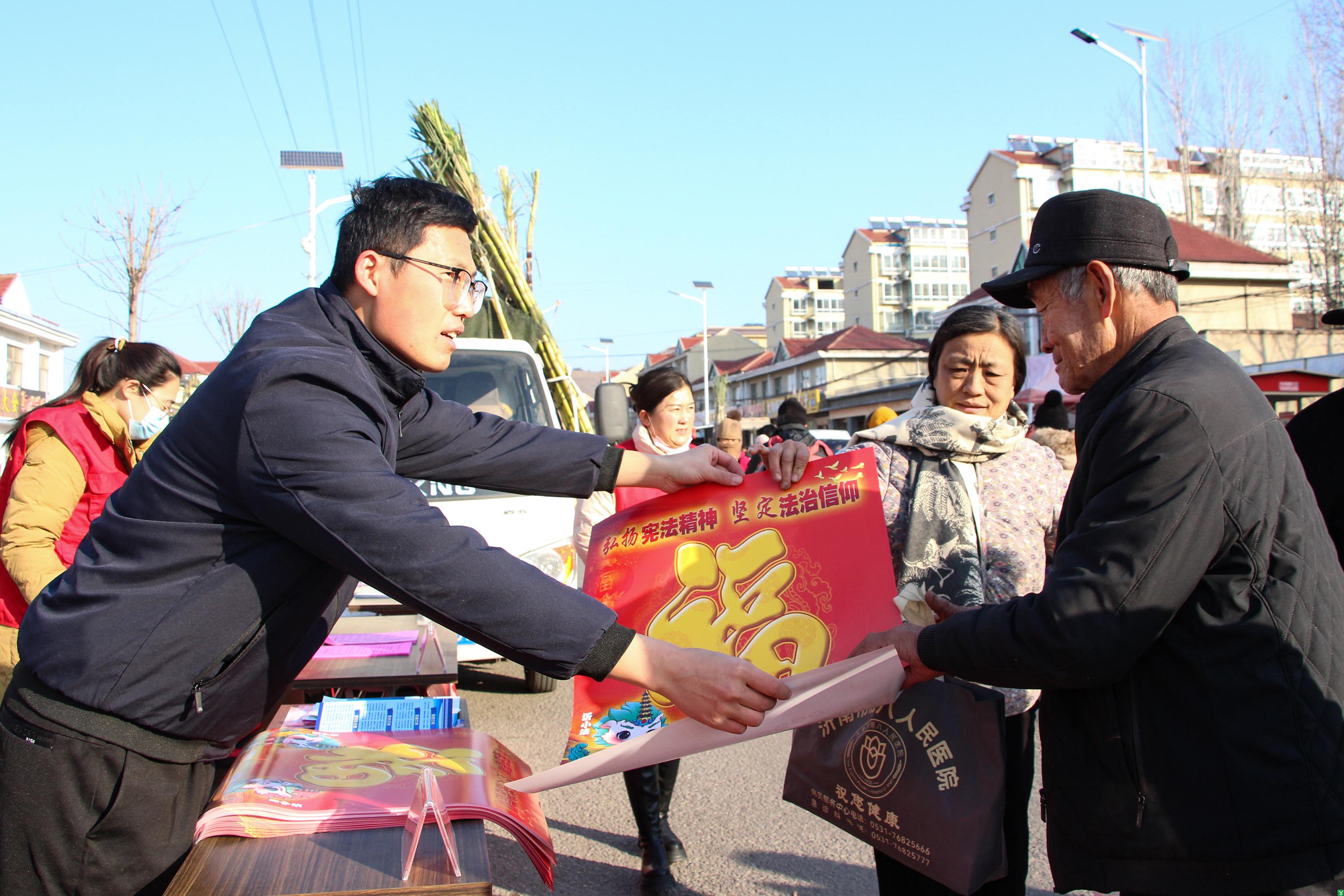志愿者们一边发放年画,一边为居民讲解宪法等法律知识要点,阐述法治守护平安生活的重要性,潜移默化提升法治意识,不断提升辖区群众尊法学法守法用法能力,本次宪法宣传活动共发放宣传宪法等法治宣传材料2000余份,解答群众法律咨询80余人次。