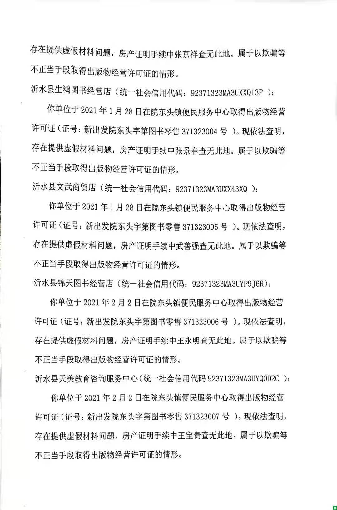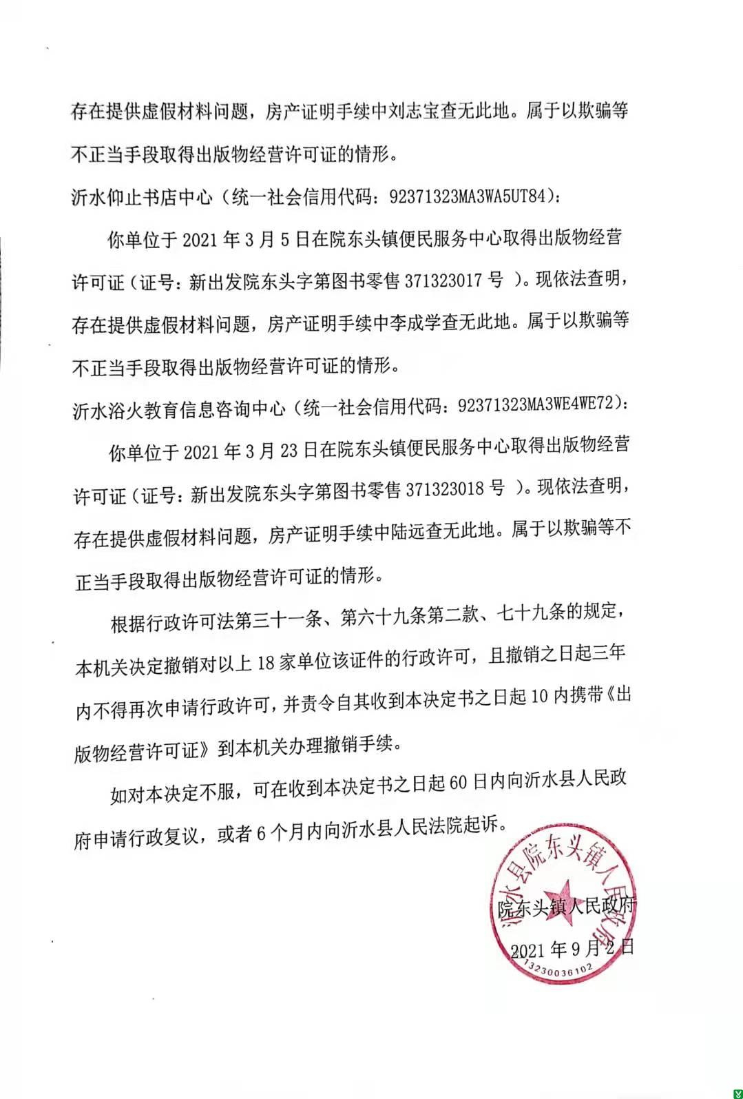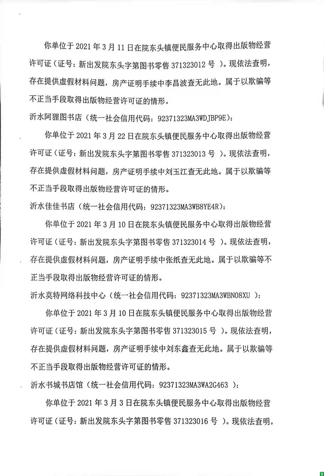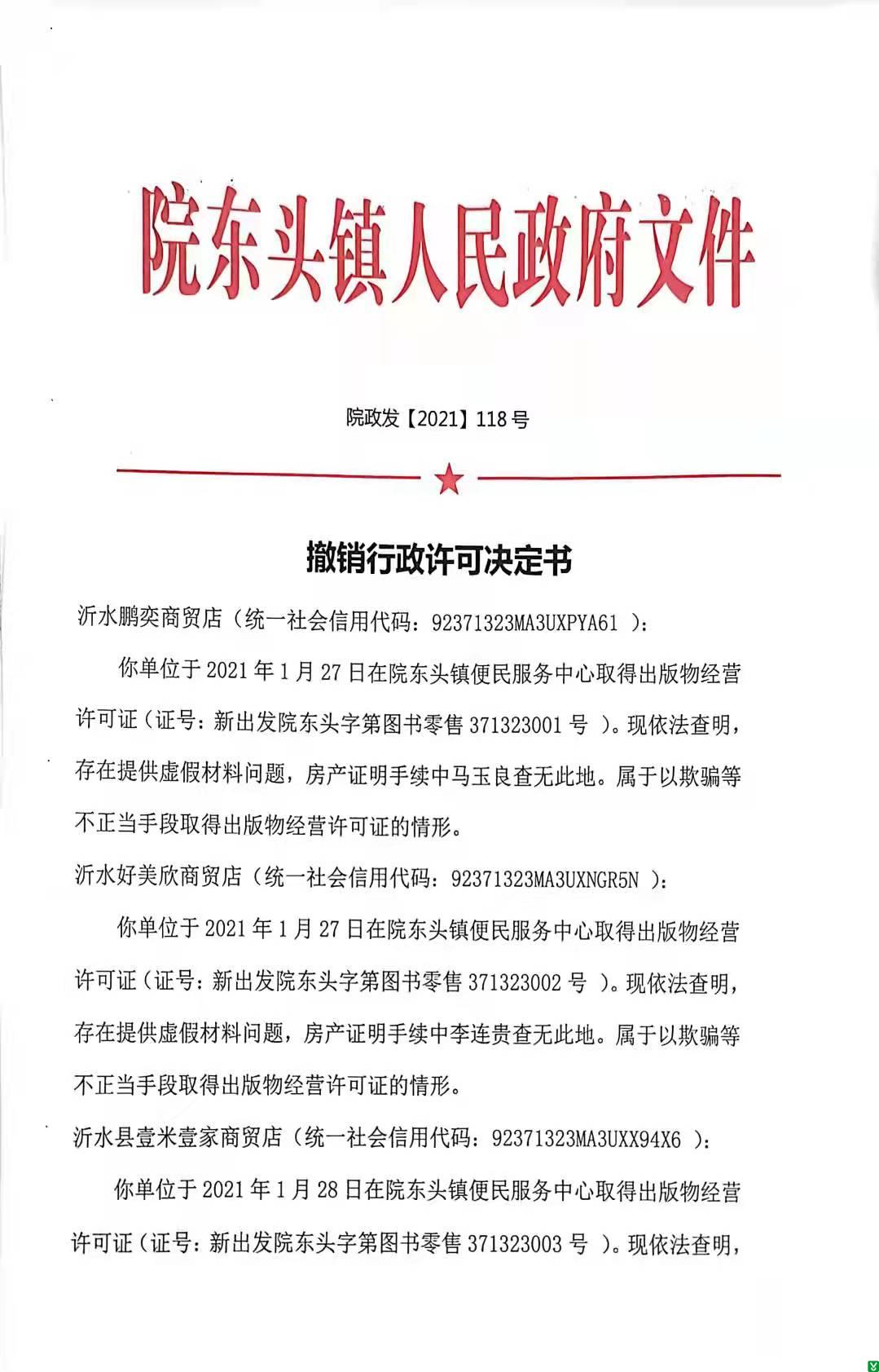 根据《出版管理条例》、《出版物市场管理规定》等法律、法规、政策规定,现对沂水鹏奕商贸店、沂水好美欣商贸店、沂水县壹米壹家商贸店、沂水县生鸿图书经营店、沂水县文武商贸店、沂水县锦天图书经营店、沂水县天美教育咨询服务中心、沂水县铁骑教育咨询工作室、沂水县清北图书经营店、沂水县清大图书经营店、沂水县爱豆商贸行、沂水啵啵图书店、沂水阿狸图书店、沂水佳佳书店、沂水莫特网络科技中心、沂水书城书店馆、沂水仰止书店中心、沂水浴火教育信息咨询中心出版物经营许可证撤销行政许可决定书予以公示,见附件。