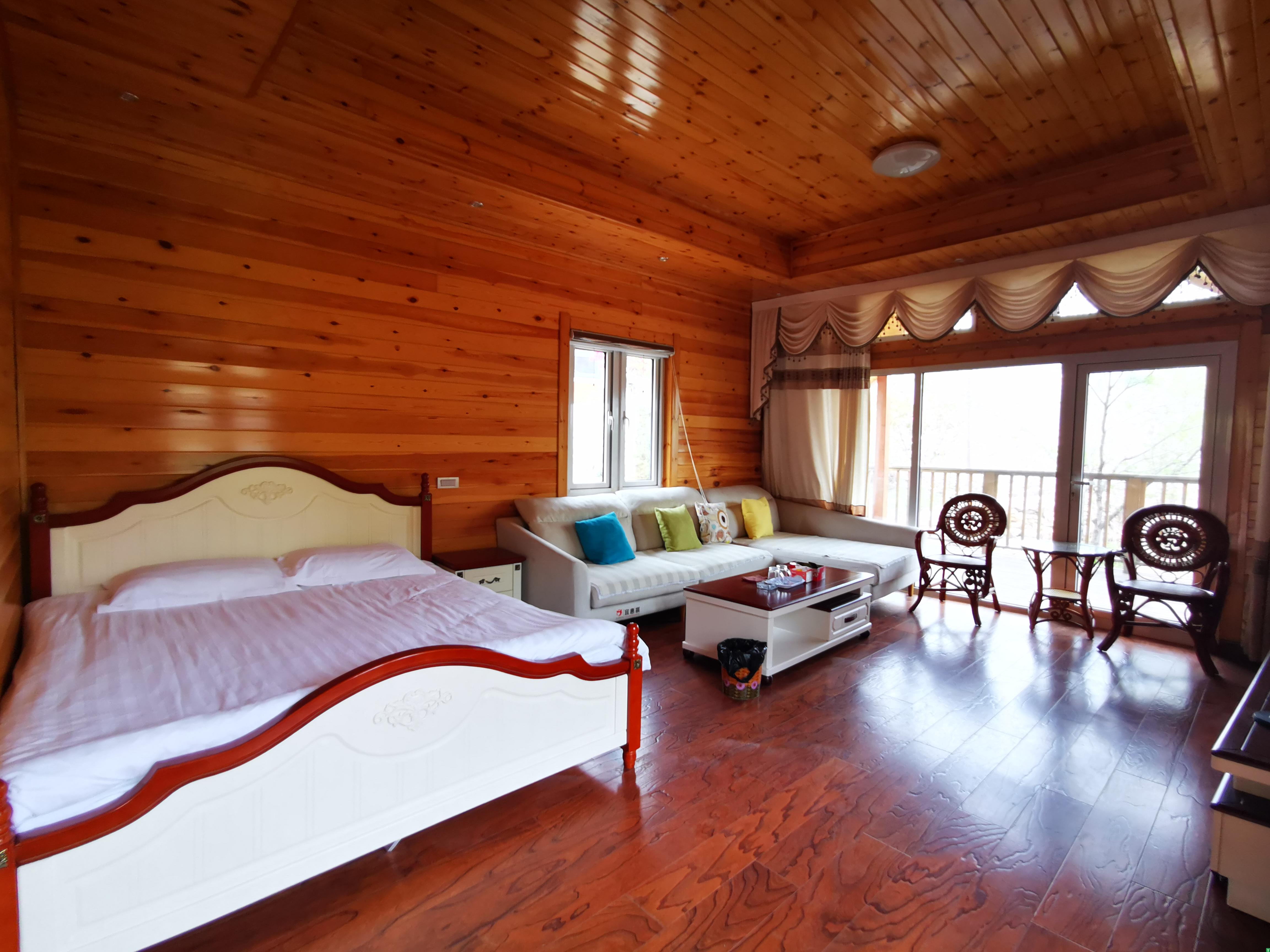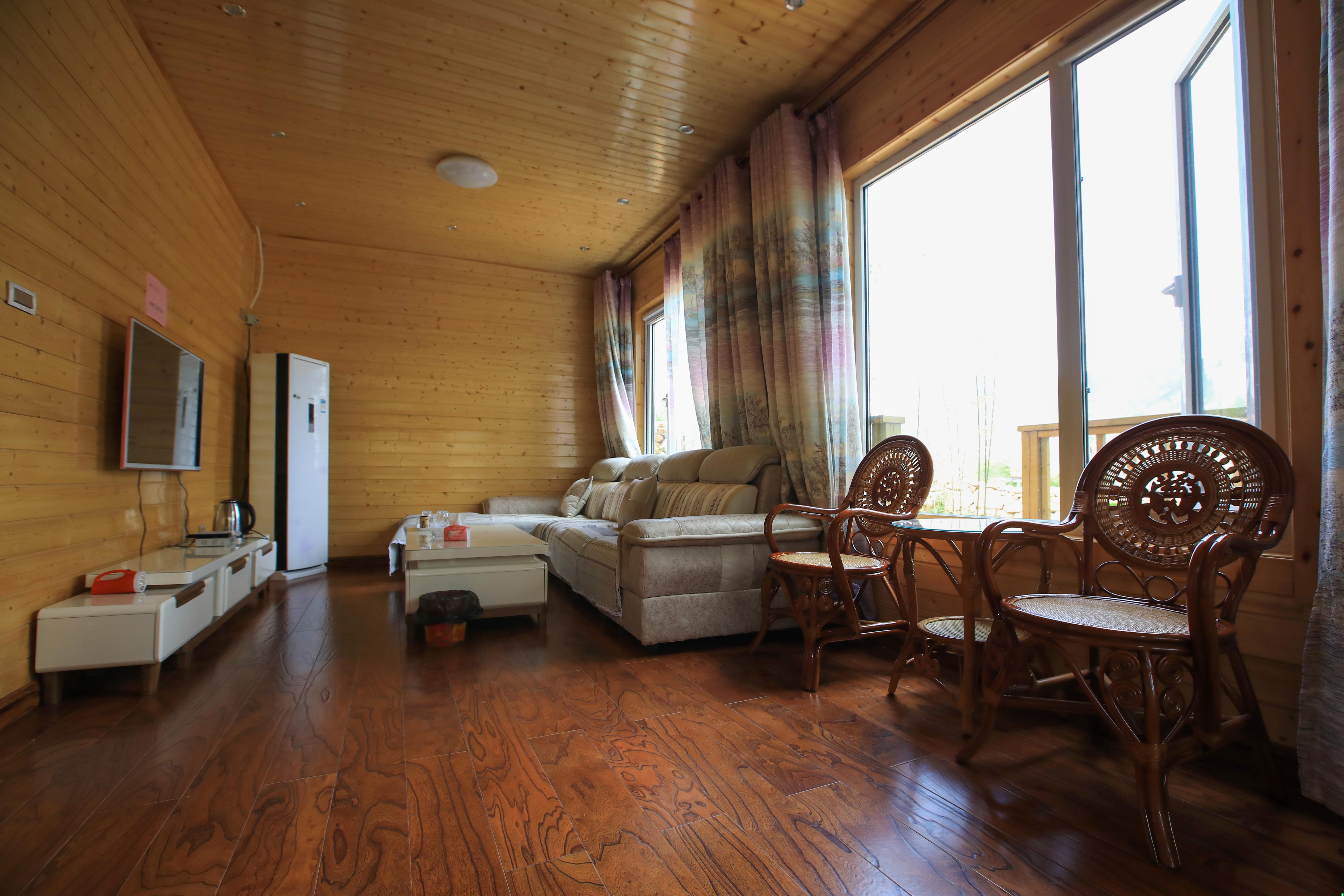 九栋木屋装修现代,带着欧式田园小清新风格,房内有舒适的大床,干净卫生的居住环境。有客厅、有卧室、有厨房,有大的软软的沙发,茶几、方桌,卧室中连床头柜、衣架也都一应俱全。客厅还配有空调、挂墙液晶电视和免费WIFI,在厨房里可以尽情的展示自己的厨艺,同时屋内有独立的卫生间,并配有热水器,一切的配置让游客像是在山间安了一处家一样,随意舒适也不耽误欣赏美景。