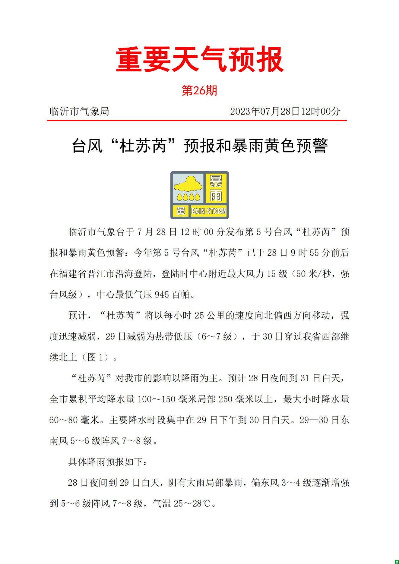 临沂市气象台于7月28日12时发布第5号台风“杜苏芮”预报和暴雨黄色预警:今年第5号台风“杜苏芮”已于28日9时55分前后在福建省晋江市沿海登陆,登陆时中心附近最大风力15级(50米/秒,强台风级),中心最低气压945百帕。