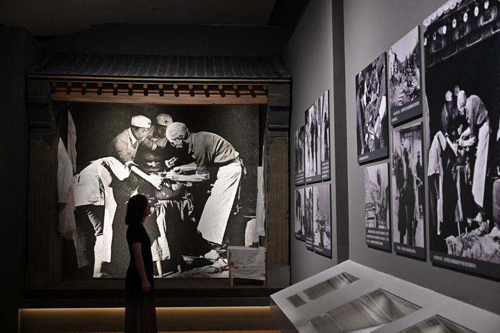 2025年9月7日,在中国国家博物馆,一名媒体人员观看白求恩的照片。新华社记者 金良快 摄