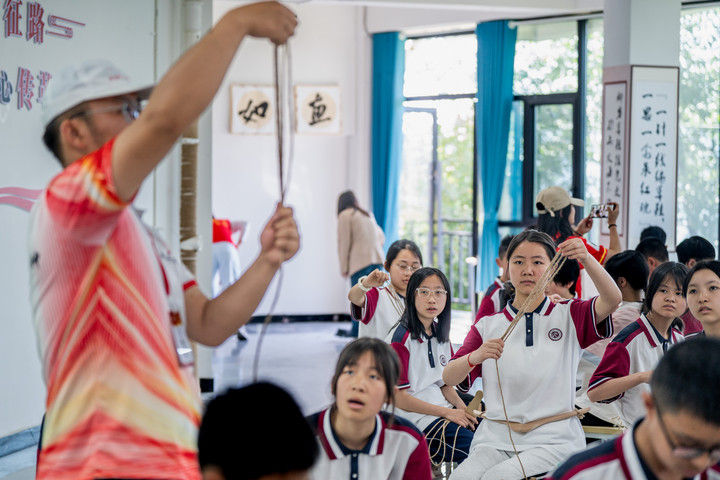 2025年5月12日,云南省昭通市威信县第一中学学生在大屏上红色研学实践基地体验编织草鞋。200余名学生在红色研学实践基地亲手编织草鞋、制作蜡染,并参观了扎西会议旧址、红军长征过云南情景体验馆,在实践互动中重温红色革命历史。威信县立足红色文化资源优势,先后建成扎西会议纪念馆、红军长征标语馆等红色文化展馆,以旧址遗迹为“教室”,以文物史料为“教材”,设计开发多门精品研学课程和线路,在深入开展红色研学系列活动中传承红色基因。