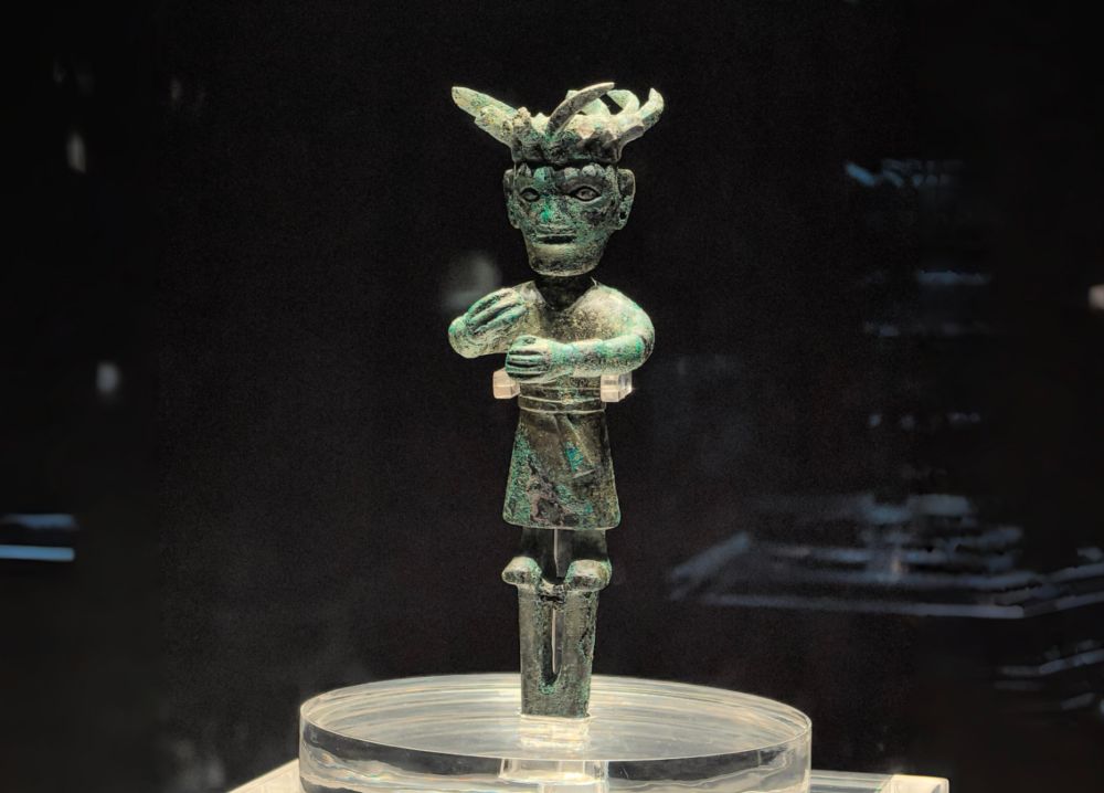 金沙遗址出土的铜立人,造型与三星堆青铜大立人相似(2025年4月9日摄)。三星堆遗址和金沙遗址都位于四川,距今约3600年至2800年,作为古蜀文明的两个中心遗址,共同勾勒出古蜀文明前后相继的辉煌图景,其出土文物是中华文明多元一体的生动例证。