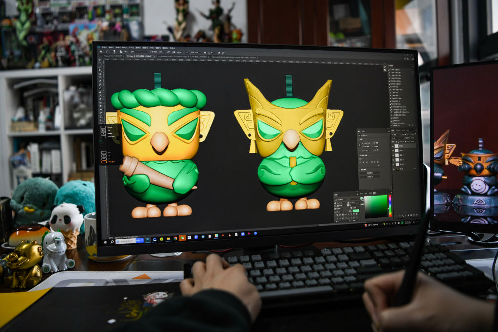 2025年3月1日,文创产品策划运营师曾舟在位于四川成都的办公室内完善文创产品细节。他以三星堆青铜神树、青铜纵目面具、青铜兽面等文物为创作蓝本,结合潮玩元素设计的文创作品广受欢迎。“我想做的不是玩具快消品,而是有内容、有温度、有意义的文化IP,让年轻一代随手摸到沉淀千年的文化。”曾舟说。