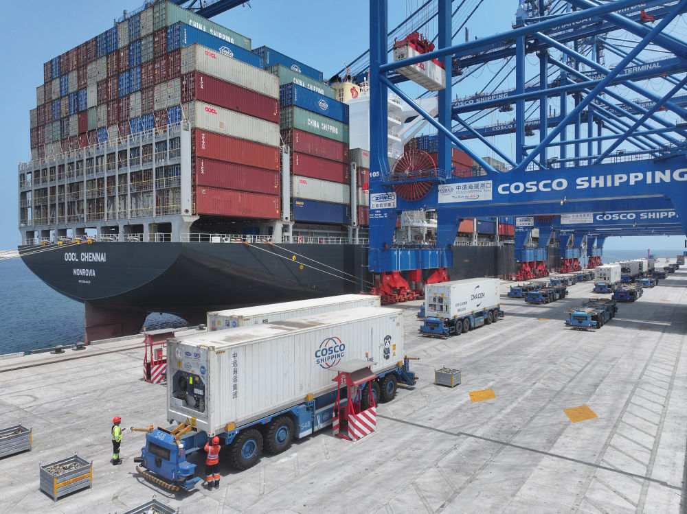 2025年10月4日,在秘鲁钱凯港,智能集卡装载到港集装箱。钱凯港是中国与秘鲁共建“一带一路”标志性项目,2024年11月正式开港,成为连接亚洲与拉美最重要的航运枢纽之一。在先进的港口管理经验与设备技术助力下,钱凯港已发展成为拉美地区领先的智慧港口。